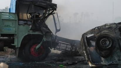 கரூர் அருகே காரின் மீது லாரி மோதியதில் கார் தீப்பிடித்து எரிந்தது. இதில் காரில் இருந்த 4 பேர் உடல் கருகி உயிரிழந்தனர்.