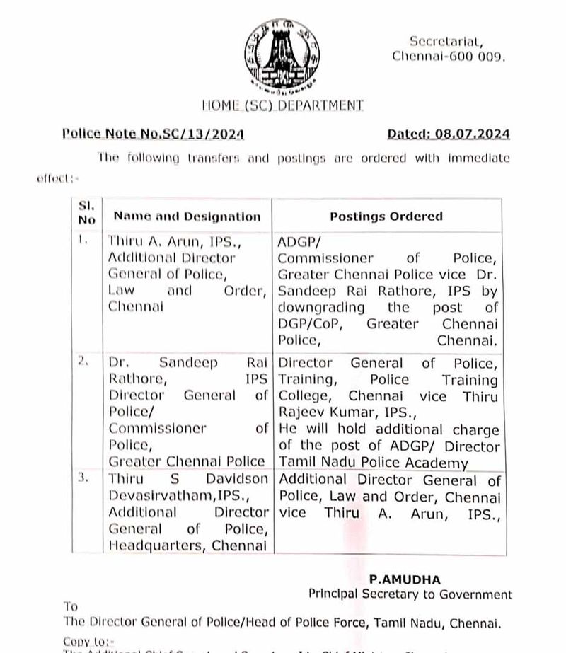 இந்த நிலையில் சென்னை காவல் ஆணையர் சந்தீப் ராய் ரத்தோரை பணியிட மாற்றம் செய்து தமிழக அரசு அதிரடி உத்தரவு பிறப்பித்துள்ளது. சட்டம் ஒழுங்கு ஏடிஜிபியாக இருந்த அருண் சென்னை மாநகர காவல் ஆணையராக நியமனம் செய்யப்பட்டுள்ளார். புதிய சட்டம் ஒழுங்கு ஏடிஜிபியாக டேவிட்சன் தேவாசிர்வாதம் நியமனம் செய்யப்பட்டுள்ளார்.
