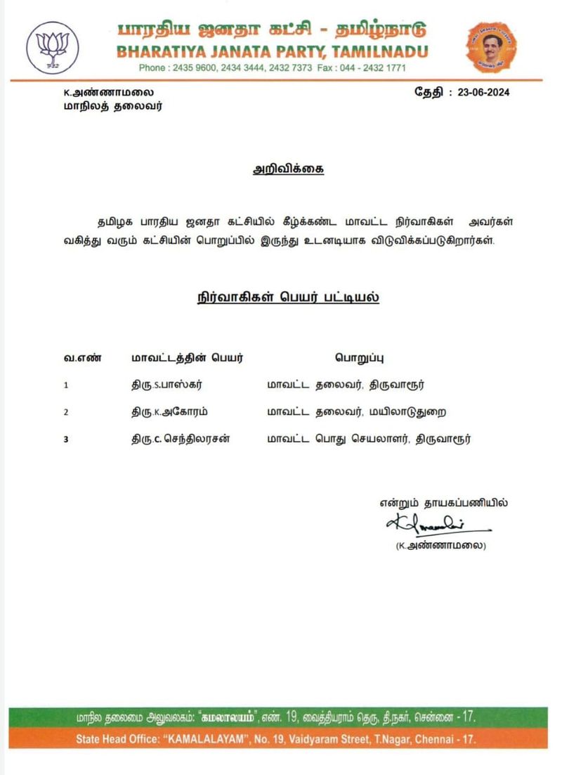 இது போன்ற பரபரப்பான சூழ்நிலையில் மேலும் இரண்டு மாவட்ட தலைவர்கள் மற்றும் ஒரு மாவட்ட பொதுச்செயலாளர் கட்சியின் பொறுப்பில் இருந்து விடுவிக்கப்பட்டுள்ளனர். இது தொடர்பாக தமிழக பாஜக மாநில தலைவர் அண்ணாமலை வெளியிட்டுள்ள அறிவிப்பில், தமிழக பாரத ஜனதா கட்சியின் கீழ்கண்ட மாவட்டத்தில் அவர்கள் வகித்து வரும் கட்சியின் பொறுப்பில் இருந்து உடனடியாக விடுவிக்கப்படுகிறார்கள் என தெரிவிக்கப்பட்டுள்ளது. அந்த வகையில் திருவாரூர் மாவட்ட பாஜக தலைவர் பாஸ்கர், மயிலாடுதுறை மாவட்ட பாஜக தலைவர் அகோரம், திருவாரூர் மாவட்ட பாஜக பொதுச்செயலாளர் செந்திலரசன் ஆகிய மூன்று பேரும் விடுவிக்கப்படுவதாக அந்த அறிக்கையில் தெரிவிக்கப்பட்டுள்ளது.
