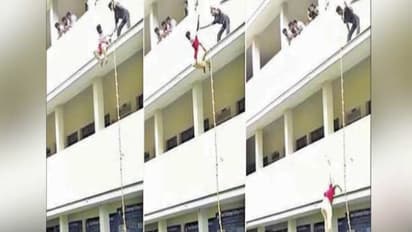3 மாடிகளை கொண்ட இந்த கல்லூரியில் 2-வது மாடியில் இருந்து மாணவிகள் கீழே குதிக்கவும், அவர்களை வலை மூலம் பிடித்து காப்பாற்றுவது போலவும் பயிற்சி நடைபெற்றது. இந்த பயிற்சி பெறுவதற்காக மாணவிகள் வரிசையாக 2-வது மாடியில் நின்றுகொண்டு இருந்தனர். மாடியில் இருந்து குதித்தால் அவர்களை காப்பாற்றுவதற்காக கீழே வலைகளை விரித்துப் பிடித்தபடி சில மாணவர்கள் காத்திருந்தனர்.