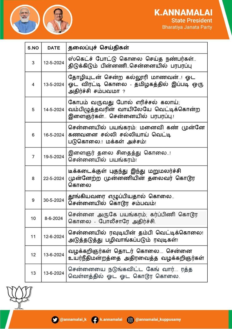 நேற்றைய தினம், தமிழக பாஜக மகளிர் அணியின் மாநிலப் பொதுச்செயலாளர், வழக்கறிஞர் நதியா சீனிவாசன் அவர்களது கணவர், சீனிவாசன் அவர்கள் மீது கூலிப்படையினரை கொண்டு கொலைவெறித் தாக்குதல் நடைபெற்றிருக்கிறது. சென்னையின் மிக முக்கியப் பகுதியான அண்ணா நகர் பகுதியில் துணை போலீஸ் கமிஷனர் அலுவலகத்திற்கு மிக அருகில், பட்டப்பகலில், பொதுமக்கள் முன்னிலையில், இந்தத் தாக்குதல் நடைபெற்றிருப்பது, முதலமைச்சர் ஸ்டாலின் பொறுப்பில் இருக்கும் காவல்துறை முற்றிலும் செயலிழந்திருப்பதைக் காட்டுகிறது. தமிழகத்தில் சட்டம் ஒழுங்கு என்பது மரணப்படுக்கையில் கிடப்பதை உணர முடிகிறது. நேற்று மட்டும் சென்னையில் நடந்த மூன்று கொலைகள், இங்கிருக்கும் சட்டம் ஒழுங்கை பிரதிபலிக்கிறது. மேலும், சென்னையில் சமீபத்தில் நடந்த சில கொடூர கொலை சம்பவங்களை பட்டியலிட விரும்புகிறோம்.
