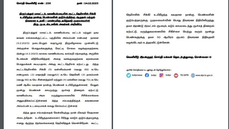 கூட்ட நெரிசலில் சிக்கி உயிரிழந்த வயதான நான்கு பெண்களின் குடும்பத்தாருக்கு, முதலமைச்சரின் பொது நிவாரண நிதியிலிருந்து, தலா இரண்டு இலட்சம் ரூபாயும், கடும் காயமடைந்து, மூச்சுத் திணறல் ஏற்பட்டு, மருத்துவமனையில் சிகிச்சை பெற்று வரும் மூன்று பெண்களுக்கு தலா 50 ஆயிரம் ரூபாய் நிவாரண நிதியுதவி வழங்கிடவும் உத்தரவிட்டுள்ளேன் என்று தெரிவிக்கப்பட்டுள்ளது.