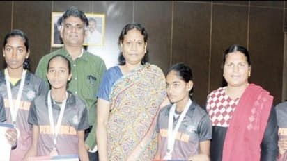 தேசிய தடகள போட்டிகளில் வென்று சாதனை படைத்த பெரம்பலூரைச் சேர்ந்த மாணவிகளுக்கு ஆட்சியர், அவரது அலுவலகத்தில் சந்தித்து பாராட்டுகளைத் தெரிவித்தார்.