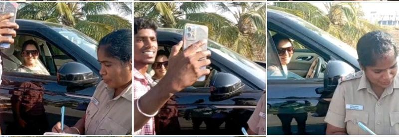 அப்போது காரில் இருப்பது அஜித்துடன் துணிவு மற்றும் தனுஷ் உடன் அசுரன் போன்ற தமிழ் மற்றும் மலையாள படங்களில் நடித்த பிரபல நடிகை என தகவல் வேகமாக பரவியது. இதனையடுத்து பின்னால் நின்று கொண்டிருந்த கார் மற்றும் இருசக்கர வாகனத்தில் வந்த ரசிகர்கள் அவருடன் நின்று புகைப்படம் எடுத்துக் கொண்டனர். அதிகளவு ரசிகர்கள் மஞ்சுவாரியர் காரை முற்றுகையிட்டதால் பரபரப்பான சூழல் உருவானது. மேலும் போக்குவரத்து நெரிசலும் ஏற்பட்டது. இதனையடுத்து மஞ்சு வாரியர் காரை வேகமாக பறக்கும் படை அதிக சோதனை செய்து விவரங்களைப் பெற்றுக் கொண்டு உடனடியாக அங்கிருந்து அனுப்பி வைத்தனர்.