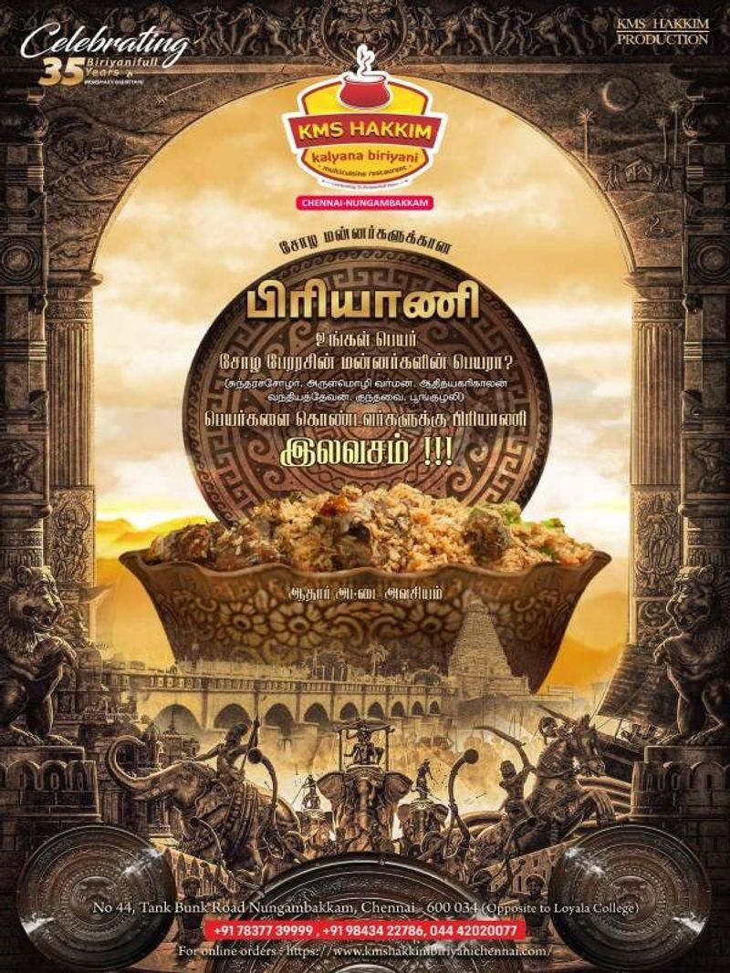 இந்த நிலையில் திருச்சியில் உள்ள பிரியாணி கடை ஒன்றில் சோழ மன்னர்களின் பெயர் வைத்திருப்பவர்களுக்கு பிரியாணி இலவசம் என்று அறிவிக்கப்பட்டுள்ளது. இதுக்குறித்த ஹக்கீம் பிரியாணி கடையின் அறிவிப்பில், சோழ மன்னர்களின் பெயர்களான சுந்தரச்சோழர், அருள்மொழி வர்மன், ஆதித்ய கரிகாலன், வந்நியத் தேவன், குந்தவை, பூங்குழலி ஆகிய பெயர்களை கொண்டவர்களுக்கு இலவசமாக பிரியாணி வழங்கி கவுரவிக்கப்படும் எனத் தெரிவிக்கப்பட்டுள்ளது.