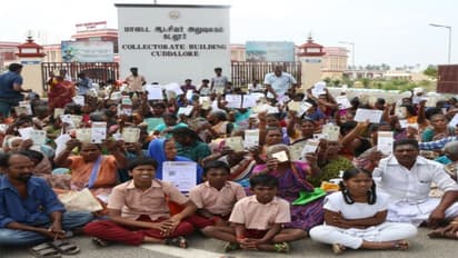 ரேசன் அட்டை உள்ளிட்ட அரசு ஆவணங்களை ஆட்சியரிடம் ஒப்படைக்க வந்த கிராம மக்கள் திடீரென போராட்டத்தில் ஈடுபட்டனர். இதனால் பரபரப்பு ஏற்பட்டது.