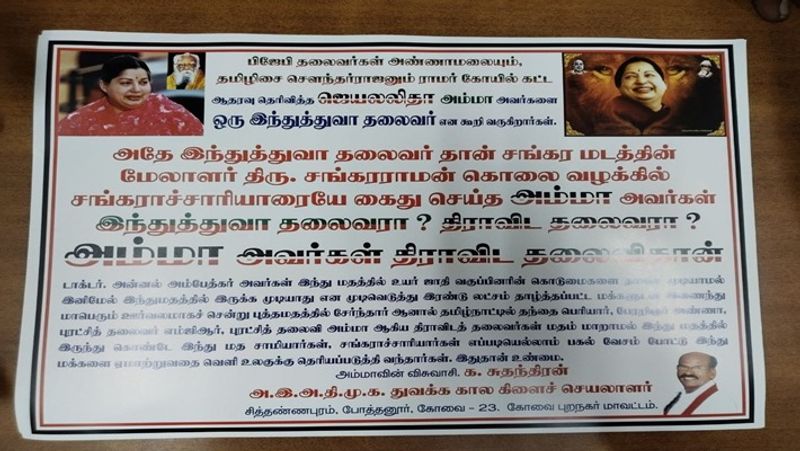 இந்த நிலையில், சங்கராச்சாரியாரை கைது செய்த ஜெயலலிதா இந்துத்துவா தலைவரா? திராவிட தலைவரா என கேள்வி எழுப்பி கோவையில் துண்டு பிரசுரங்கள் விநியோகிக்கப்பட்டு வருகின்றன. சங்கராச்சாரியாரையே கைது செய்த ஜெயலலிதா இந்துத்துவா தலைவரா? திராவிட தலைவரா? எனக் கேள்வி எழுப்பி கோவையில் அதிமுக கிளை செயலாளர் ஒருவர் துண்டு பிரசுரங்களை விநியோகித்து வருகிறார்.