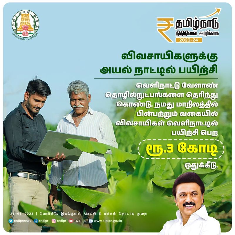 காண்பது நம்பிக்கையாகவும், செய்வது கற்றலாகவும் மாறும். எனவே, 150 முன்னோடி விவசாயிகளை இஸ்ரேல், நெதர்லாந்து. தாய்லாந்து, எகிப்து, மலேசியா, பிலிப்பைன்ஸ் போன்ற நாடுகளுக்கு அழைத்துச் செல்ல திட்டமிடப்பட்டுள்ளது. இத்திட்டத்திற்கென ஒன்றிய, மாநில அரசு நிதியிலிருந்து மூன்று கோடி ரூபாய் நிதி ஒதுக்கீடு செய்யப்படும்.பாடப் புத்தகங்களில் படமாகவும், ஊடகங்களில் காணொலியாகவும் கண்ட வயல்களை, தோப்புகளை, தோட்டங்களை, பாசனக் கிணறுகளை, பழமரங்களை, மாணவர்கள் நேரடியாக காண வேண்டுமென்பதற்காகவும். வேளாண்மையின் மகத்துவத்தை அவர்கள் அறிந்து, உணர்ந்து, தெளிந்து, தேற வேண்டுமென்பதற்காகவும்,
