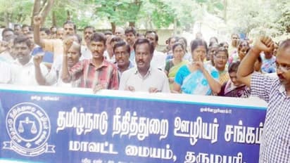 பல்வேறு கோரிக்கைகளை வலியுறுத்தி தருமபுரி மாவட்டத்தில் உள்ள நீதிமன்றங்களில் பணிபுரியும் நீதித்துறை அமைச்சுப் பணியாளர்கள் பணிகளைப் புறக்கணித்து நேற்று இரண்டாவது நாளாக வேலை நிறுத்தப் போராட்டத்தில் ஈடுபட்டனர்.