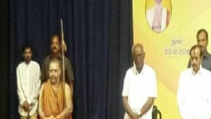 விழா துவங்கியவுடன் தேசிய கீதம் இசைக்கப்பட்டது. அப்போது, மேடையில் அமைர்ந்திருந்த விஜயேந்திரர் உள்ளிட்ட அனைவரும் எழுந்து நின்றனர். இதன் பின்பு, தமிழ்த்தாய் வாழ்த்து இசைக்கப்பட்டது.