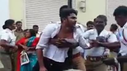 அந்த வீடியோவில், இளைஞர் பிரகாஷ் மற்றும் அவரது அம்மா சங்கீதாவை போக்குவரத்து போலீசார் இழுத்துக் கொண்டு சாலை ஓரத்துக்கு அழைத்து வருகின்றனர். பிரகாஷை போலீசார் ஒருவர் பிடித்து வைத்துள்ளார். போலீசாரிடம் வாக்குவாதம் செய்யும் சங்கீதா, மகனை விடுவிக்க போராடுகிறார்.