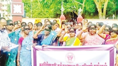 நாகப்பட்டினத்தில் பல்வேறு கோரிக்கைகளை வலியுறுத்தி கண்களில் கருப்பு துணிக்கட்டி சத்துணவு ஊழியர்கள் ஆர்ப்பாட்டத்தில் ஈடுபட்டனர்.