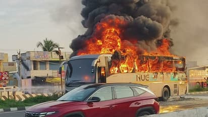 சென்னை கோயம்பேட்டில் இருந்து இன்று காலை 30க்கும் மேற்பட்ட பயணிகளை ஏற்றிய இ பேருந்து ஒன்று, பெங்களூரை நோக்கி புறப்பட்டது. அந்த பேருந்து பூந்தமல்லி சாலையில் உள்ள பாப்பாசத்திரம் அருகே சென்ற போது பின் பக்கமாக வந்த தனியார் பேருந்து மோதியுள்ளது. அப்போது பேருந்து பின் பகுதி சேதமடைந்து தீப்பிடிக்க தொடங்கியது. இதனால் அதிர்ச்சி அடைந்த பயணிகள் அலறி அடித்து ஓட தொடங்கினர். பேருந்தில் பின் பகுதியில் பேட்டரி மற்றும் என்ஜின் இருப்பதால் அதில் பற்றிய தீ பேருந்து முழுவதும் பரவ தொடங்கியது.