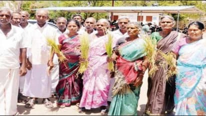 முசிறி தாலுகா திண்ணனூர் கிராமத்தைச் சேர்ந்த மக்கள் கையில் நெற்பயிர்களை வைத்து கொண்டு திரளாக வந்து மனு ஒன்றை கொடுத்தனர்.