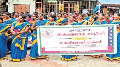 சிவகங்கை மாவட்ட அங்கன்வாடி ஊழியர் மற்றும் உதவியாளர் சங்கத்தினர் பல்வேறு கோரிக்கைகளை வலியுறுத்தி சிவகங்கை அரண்மனை வாசல் முன்பு கண்டன ஆர்ப்பாட்டத்தில் ஈடுபட்டனர்.