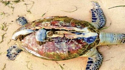ஏர்வாடி கடற்கரையில் பாறையில் மோதி இறந்த அபூர்வ பச்சை ஆமை கரை ஒதுங்கியது.