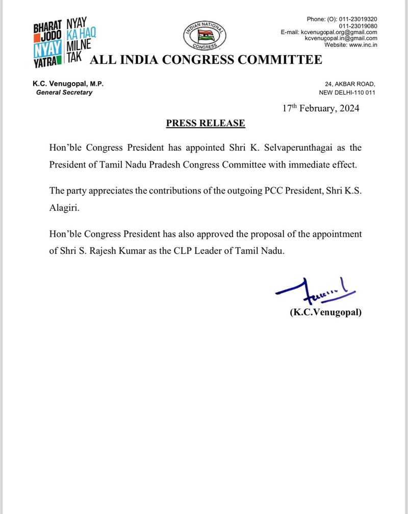இதனை அடுத்து ஏற்கனவே தமிழக காங்கிரஸ் கமிட்டியின் தலைவராக இருந்து வந்த கே. எஸ் அழகிரி அந்த பதிவில் இருந்து நீக்கப்பட்டுள்ளார் என்பதும் குறிப்பிடத்தக்கது. நாடாளுமன்ற தேர்தல் நெருங்கி வரும் நேரத்தில் காங்கிரஸ் இணைந்த அதிரடி முடிவு மிகப் பெரிய முன்னெடுப்பாக பார்க்கப்படுகிறது. அதே நேரத்தில் செல்வப்பெருந்தகை ஏற்கனவே வகித்து வந்த காங்கிரஸ் சட்டமன்ற குழு தலைவர் பதவியை சட்டமன்ற உறுப்பினரான ராஜேஷ் குமாருக்கு வழங்கப்பட உள்ளது என்கின்ற தகவலும் வெளியாகி உள்ளது.