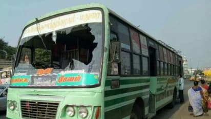 இருசக்கர வாகனத்தில் வந்த மர்ம நபர்கள், பேருந்தின் மீது கல் வீசித் தாக்குதல் நடத்தியுள்ளனர். இதில், பேருந்தின் கண்ணாடி குத்தியதில் ஓட்டுநர் குடியரசு கையில் காயம் ஏற்பட்டது.