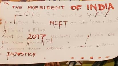 இந்த நிலையில், திருச்சியைச் சேர்ந்த மாணவி ஐஸ்வர்யா ரத்தத்தைக் கொடு ஒரு போஸ்டர் எழுதியுள்ளார். அதில், கடந்த ஆண்டைப் போல மாணவர் சேர்க்கையை இந்த ஆண்டும் நடத்த தமிழக அரசு நடவடிக்கை எடுக்காதது ஏன்? ஒரு பொதுத்தேர்வு பொதுவான பாடத்திட்டத்தைக் கொண்டு நடத்தப்படாதது அநீதி என்று ஐஸ்வர்யா கூறியுள்ளார்.