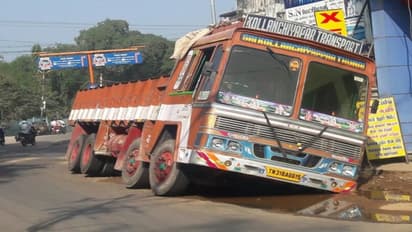 இதில், அந்த லாரியில் ஒருபக்கம் அப்படியே பூமியில் புதைந்தது. ஓட்டுநர் எவ்வளவோ முயற்சித்தும் லாரியை பள்ளத்தில் இருந்து மீட்க முடியவில்லை.