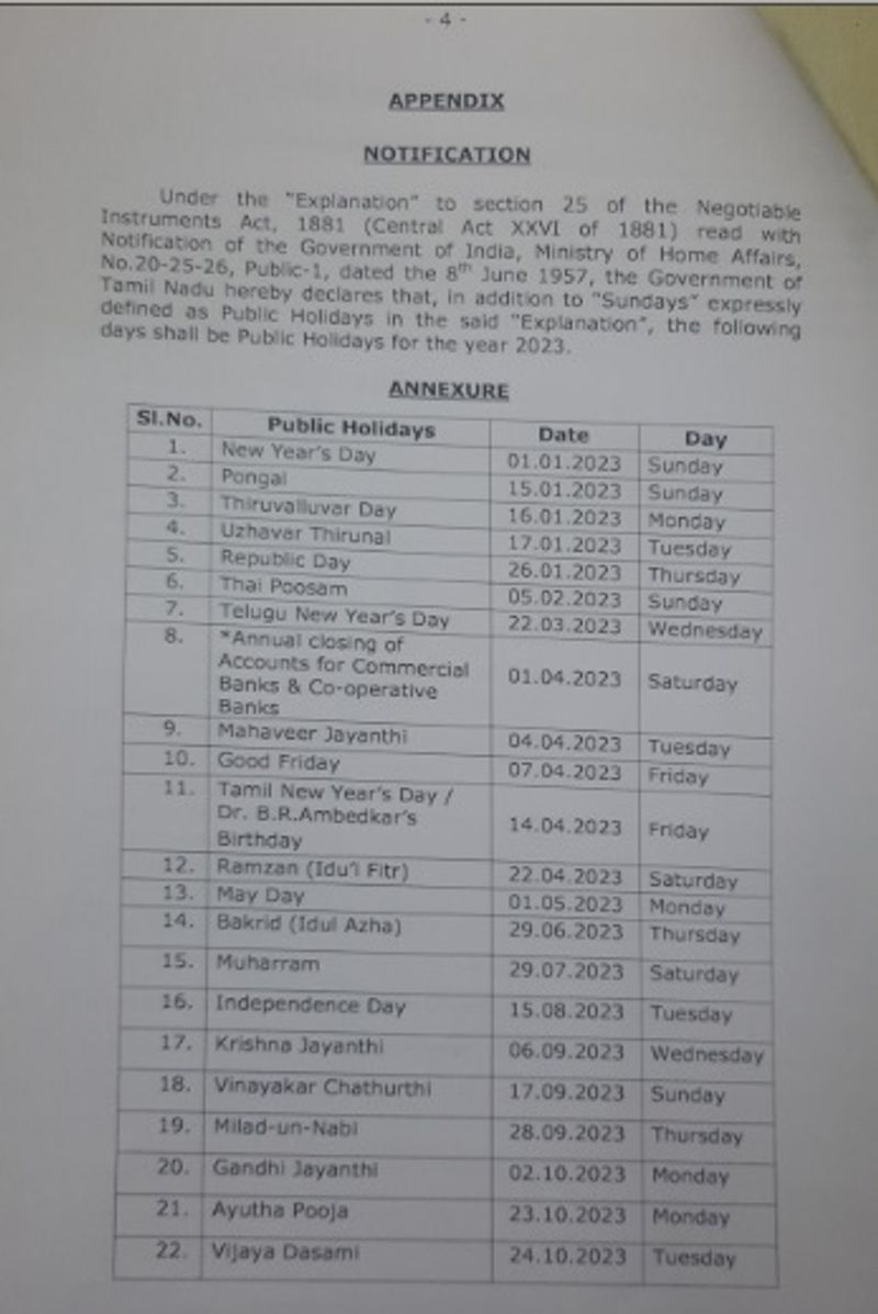 Tamilnadu Government holidays 2023 : தமிழ்நாடு அரசு 2023ஆம் ஆண்டுக்கான விடுமுறை நாட்கள் அறிவிப்பு