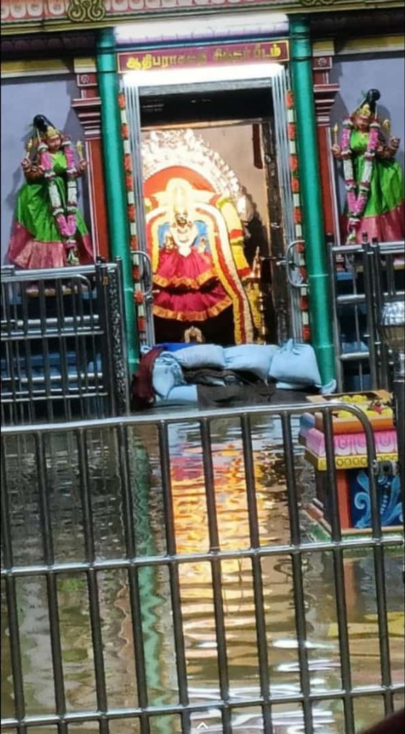 சென்னைக்கு அருகே உள்ள மிக முக்கிய வழிபாட்டுத் தலமான மேல்மருத்தூர் செங்கல்பட்டு மாவட்டத்தில் வருகிறது. இங்கும் அதி கனமழை பெய்து வருகிறது. நாள்தோறும் பல லட்சக்கணக்கான பக்தர்கள் வருகை தரும் மேல்மருவத்தூர் ஆதிபராசக்தி ஆலயம் மழை காரணமாக கடுமையான வெள்ளம் சூழ்ந்து காணப்படுகிறது. குறிப்பாக கோவில் கருவரை பரையில் வெள்ளம் சூழ்ந்திருப்பதால் பக்தர்கள் வேதனை அடைந்துள்ளனர். கோவிலின் பல இடங்களில் பக்தர்கள் அன்றாடம் வழிபடும் புற்றுக்கோவிலக்ளும் உள்ளன என்பதால் உடனடியாக இதனை சரி செய்ய முயற்சிகள் மேற்கொள்ளப்பட்டுள்ளன.
