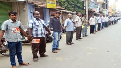 ஜி.எஸ்,டியில் நெசவுத் தொழிலுக்கு விலக்கு கேட்டு ஐந்தாவது நாளாக கடையடைப்பு போராட்டம் செய்த நெசவு வியாபாரிகள் மனிதசங்கிலிப் போராட்டத்திலும் ஈடுபட்டனர். ஐந்து நாள்களில் மொத்தம் ரூ.150 கோடி இழப்பு என்று வணிகர்கள் வருத்தப்பட்டனர்.
