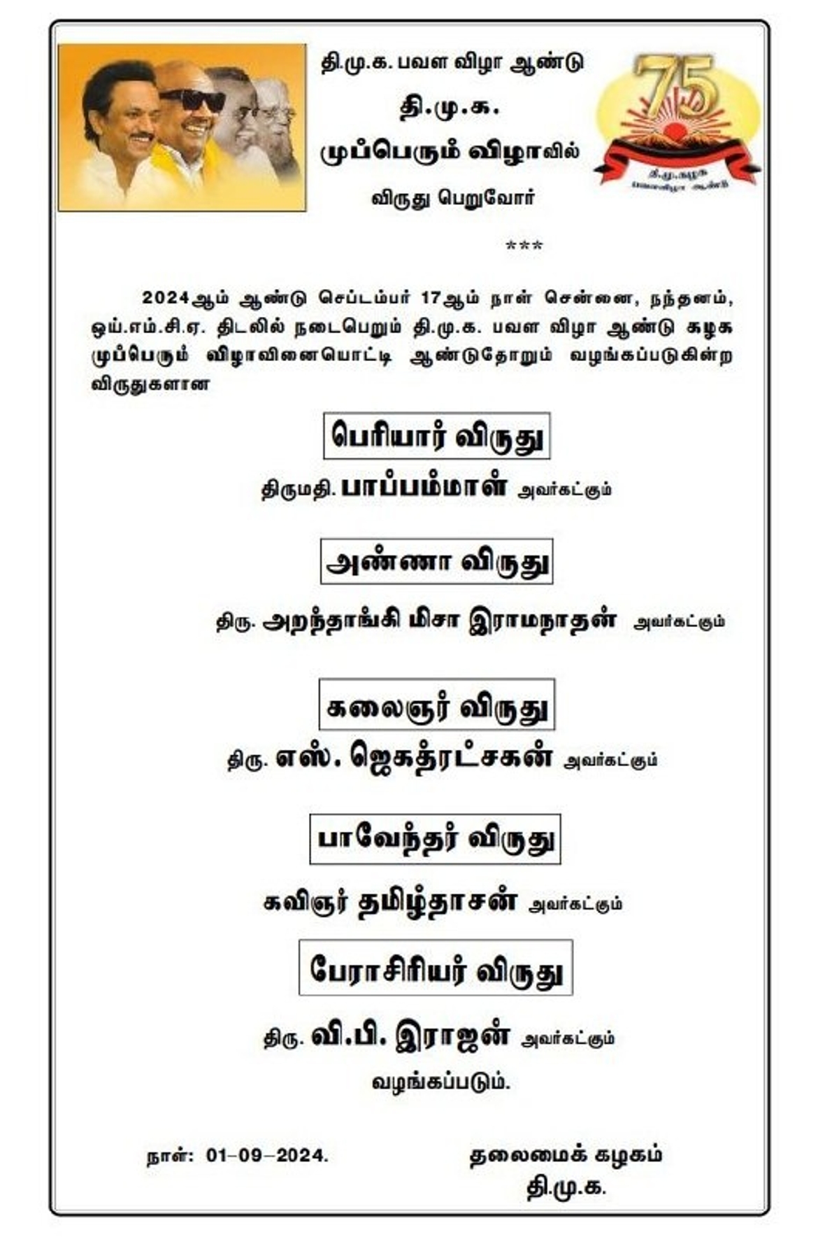 இந்தநிலையில் தமிழுக்கும் தமிழ்நாட்டிற்காகவும் பாடுபட்டவர்களுக்காக திமுக சார்பாக விருது வழங்கப்படுகிறது. இது தொடர்பாக திமுக தலைமை வெளியிட்டுள்ள அறிவிப்பில், 2024ஆம் ஆண்டு செப்டம்பர் 17ஆம் நாள் சென்னை, நந்தனம், ஒய்.எம்.சி.ஏ. திடலில் நடைபெறும் தி.மு.க. பவள விழா ஆண்டு கழக முப்பெரும் விழாவினையொட்டி ஆண்டுதோறும் வழங்கப்படுகின்ற விருதுகளுக்கான பட்டியல் வெளியிடப்படுகிறது. அந்த வகையில் பெரியார் விருது திருமதி.பாப்பம்மாள் அவர்களுக்கும், அண்ணா விருது அறந்தாங்கி மிசா இராமநாதன் அவர்கட்கும், கலைஞர் விருது எஸ். ஜெகத்ரட்சகன் அவர்கட்கு வழங்கப்படவுள்ளது.