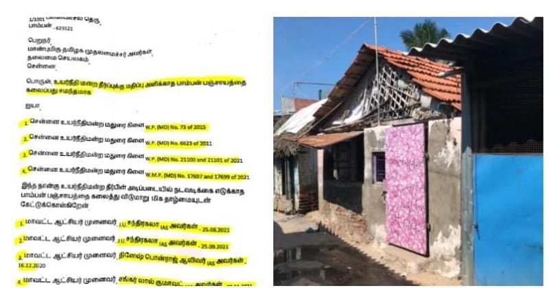 இந்த மனுக்கள் மீது உரிய நடவடிக்கை எடுக்குமாறு மாவட்ட ஆட்சியரிடம் இருந்து பிடிஓ மற்றும் ராமேஸ்வரம் தாசில்தாருக்கு கடிதம் மட்டுமே கடந்த எட்டு வருடங்களாக சென்று கொண்டு உள்ளது. ஆனால் நீதிமன்ற உத்தரவு மீது உரிய நடவடிக்கை எடுக்காத நிலைதான் இருந்து வந்துள்ளது. இந்தநிலையில் தனது நிலத்தை மீட்டு தரக்கோரி நீதிமன்றம் உத்தரவு பிறப்பித்துள்ள நிலையில் அதனை செயல்படுத்தாத பாம்பன் பஞ்சாயத்தை கலைக்க கோரி முதலமைச்சர் தனிப்பிரிவில் தற்போது புதிய புகார் ஒன்றை கொடுத்துள்ளதாக நபிஷா பானு தெரிவித்துள்ளார். இந்த புகார் மனு தொடர்பாக செய்தியாளர்களிடம் பேசிய நபிஷா பானு, தனது சேமிப்பில் வாங்கிய இடத்தில் முன்னாள் ஊராட்சி மன்ற தலைவரும், இன்னாள் ஊராட்சி மன்ற தலைவியின் கணவருமான பேட்ரிக் உள்ளிட்டவர்கள் ஆக்கிரமிப்பு செய்துள்ளதாகவும், இதே போல தனது இடத்தில் மேலும் 3 பேர் கடைகள் வைத்துள்ளதாக தெரிவித்தார். நீண்ட போராட்டத்திற்கு பிறகு நிலத்தை மீட்க மாவட்ட ஆட்சியர் அலுவலகத்தில் இருந்து நோட்டீஸ் வந்த நிலையில் ஆக்கிரமிப்பாளர்கள் மீண்டும் நீதிமன்றம் சென்றதாகவும் கூறியுள்ளார், மனுவை விசாரித்த நீதிமன்றம் ஆக்கிரமிப்பாளர்களின் வழக்கை தள்ளுபடி செய்து உத்தரவிட்டதாக தெரிவித்தார். இருந்த போதும் ஆக்கிரமிப்பாளர்களுக்கு மாற்று இடம் வழங்குமாறு மாவட்ட ஆட்சியருக்கு நீதிமன்றம் உத்தரவிட்டுள்ளதாக கூறினார்.