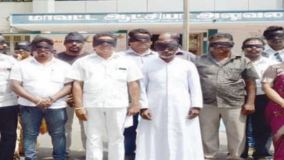 இரமேசுவரம் மீனவர் இலங்கை கடற்படையினரால் சுட்டுக்கொல்லப்பட்ட சம்பவத்துக்கு கண்டனம் தெரிவித்து கண்களை கருப்புத்துணியால் கட்டிக் கொண்டனர்.