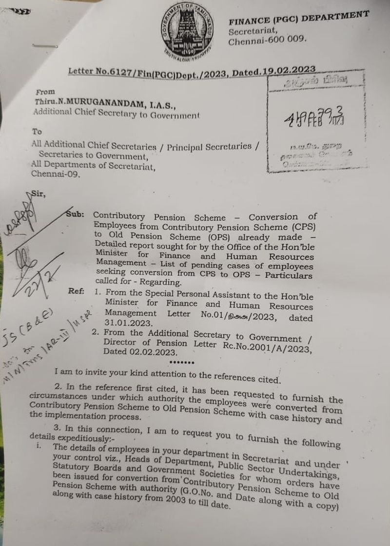இந்த நிலையில் புதிய ஓய்வூதிய திட்டத்தில் இருந்து பழைய ஓய்வூதிய திட்டத்திற்கு மாற்றப்பட்டுள்ளனரா? உள்ளிட்ட விவரங்களை சேகரித்து சமர்பிக்க அனைத்து துறை செயலாளர்களுக்கும் நிதித்துறை செயலாளர் உத்தரவிட்டுள்ளார். இதுக்குறித்து அனைத்து துறை செயலாளர்களுக்கும் அவர் எழுதிய கடிதத்தில், 2003 ஆம் ஆண்டில் இருந்து தற்போதுவரை உள்ள புதிய ஓய்வூதிய திட்டத்தில் இருந்து பழைய ஓய்வூதிய திட்டத்திற்கு மாற்றப்பட்டுள்ளனரா?