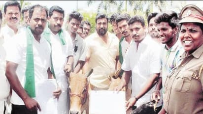 இந்த நிலையில் காவிரிக்காக போராடிய மாணவர்களை காவலாளர்கள் கைது செய்து சிறையில் அடைத்துள்ளனர். அவர்களை விடுதலை செய்யக்கோரி கால்நடைகளுடன் மனு கொடுக்க வந்துள்ளோம்.