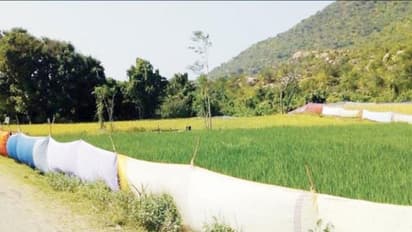விவசாய நிலங்களை சேதப்படுத்தும் காட்டுப் பன்றிகளைத் தடுக்க விளை நிலங்களை சுற்றி வண்ண வண்ண சேலைகளை கட்டி நிலங்களை காத்து வருகின்றனர் விவசாயிகள்.