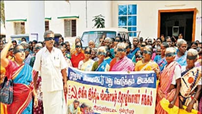 விருதுநகரில், விவசாய தொழிலாளர் சங்கத்தின் பெண்கள் தங்களது கண்களில் கருப்பு துணி கட்டிகொண்டு ஊராட்சி ஒன்றிய அலுவலகம் முன்பு ஆர்ப்பாட்டத்தில் ஈடுபட்டனர்.