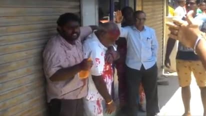 மிரட்டிக் கொண்டிருந்த அந்த இளைஞரிடம் இருந்து முதியவரை மீட்க ஒருவர் கல்லைகொண்டு எறிந்துள்ளார் அந்த இளைஞர் விலகிக்கொள்ள முதியவர் தலையில் பட்டு ரத்தம் வழிந்துள்ளது.