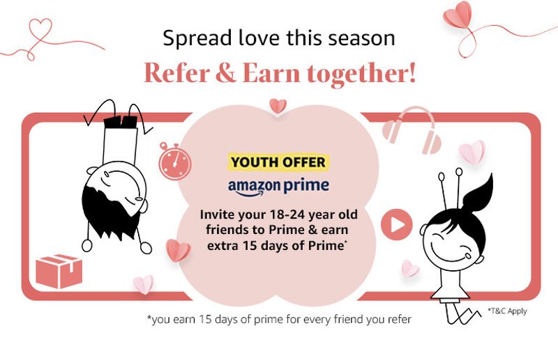 அமேசான் நிறுவனம் சமீபத்தில் பிரைம் ரெஃபரல்ஸ் திட்டத்தை 18 முதல் 24 வயதுள்ள பயனர்களுக்கு அறிவித்தது. இதை கொண்டு பிரைம் சந்தாவில் 50 சதவீதம் தள்ளுபடி பெற முடியும். ஏற்கனவே யூத் ஆஃபரில் சேர்ந்திருப்பவர்கள் தங்களின் 18 முதல் 24 வயதுள்ள நண்பர்களுக்கு பிரைம் ரெஃபர்களை அமேசான் ஆப் மூலம் அனுப்ப வேண்டும்.