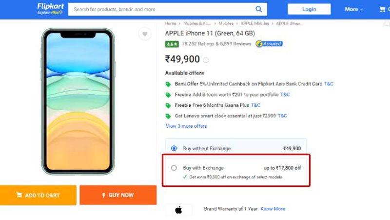 இந்த சலுகை சில விதிமுறைகளுக்கு உட்பட்டு வழங்கப்படுகிறது. இந்தியாவில் ஐபோன் 11 (64GB) மாடல் விலை ரூ. 49,900 என்றும் ஐபோன் 11 (128GB) விலை ரூ. 54,900 என்றும் நிர்ணம் செய்யப்பட்டு உள்ளது. இரு மாடல்களுக்கும் ப்ளிப்கார்ட் தளத்தில் ரூ. 17,800 வரை தள்ளுபடி வழங்கப்படுகிறது.