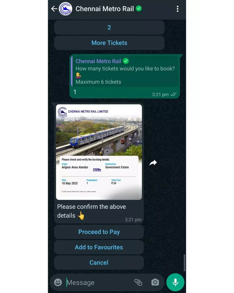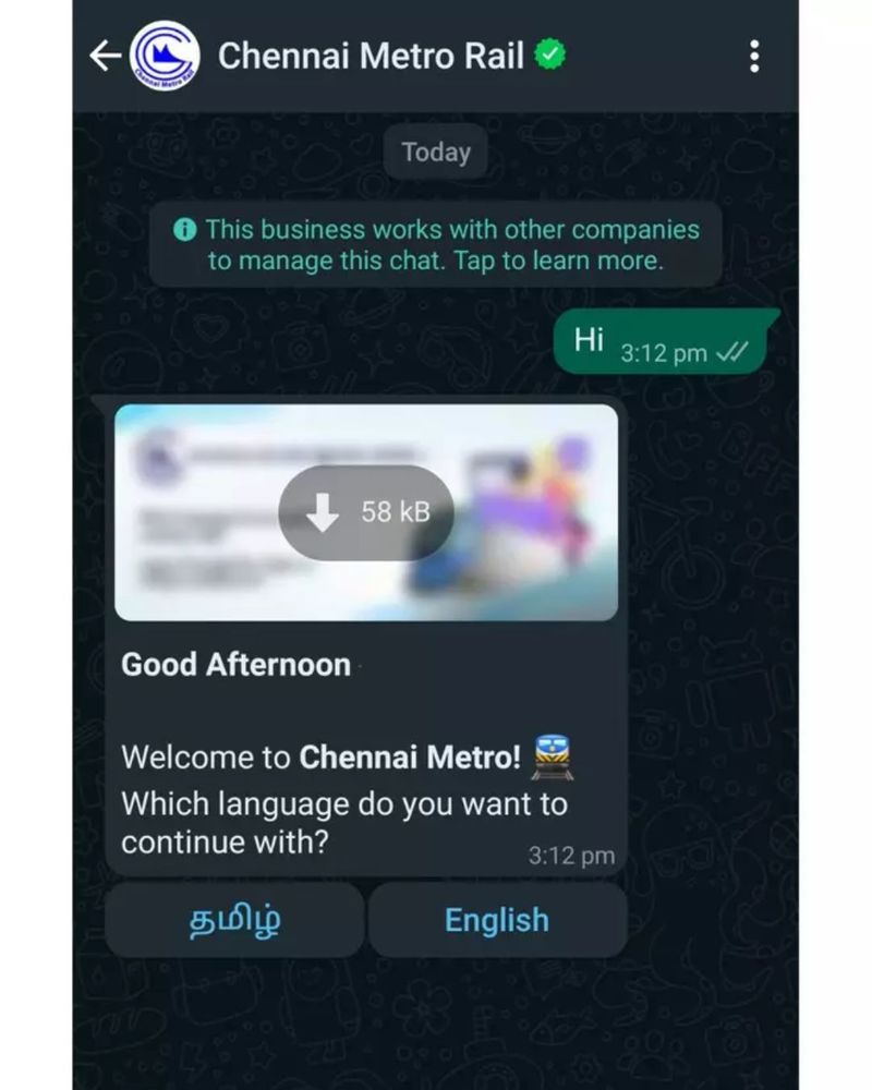 சென்னை மெட்ரோ ரயில் லிமிடெட் (CMRL) ஆண்ட்ராய்டு மற்றும் iOS இயங்குதளத்தில் WhatsApp chatbot அடிப்படையிலான QR டிக்கெட் சேவையை அறிமுகப்படுத்தியுள்ளது. இந்த சாட்பாட் தமிழ் மற்றும் ஆங்கிலம் ஆகிய இரண்டு மொழிகளை ஆதரிக்கிறது.