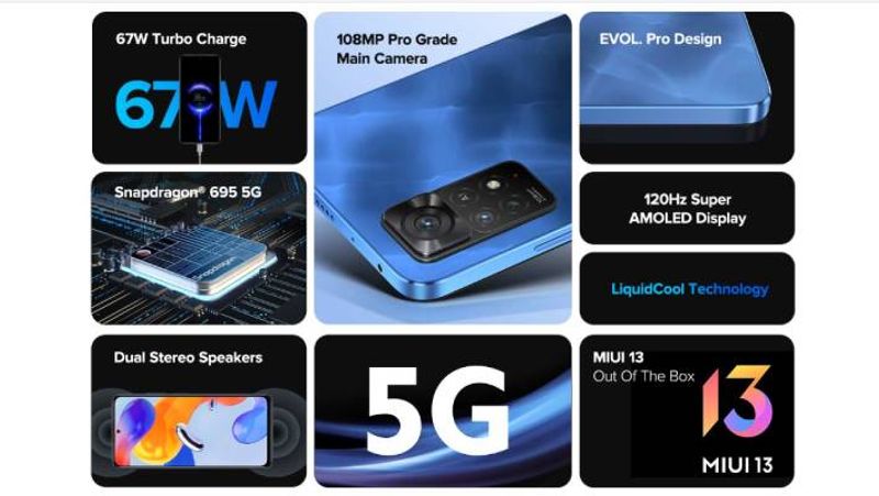 ரெட்மி நோட் 11 ப்ரோ பிளஸ் 5ஜி மாடலில் 6.67 இன்ச் FHD+ 120Hz AMOLED டாட் டிஸ்ப்ளே, 16MP செல்ஃபி கேமரா, குவால்காம் ஸ்னாப்டிராகன் 695 பிராசஸர், லிக்விட் கூலிங், அதிகபட்சம் 8GB ரேம், 108MP பிரைமரி கேமரா, 8MP அல்ட்ரா வைடு கேமரா, 2MP மேக்ரோ கேமரா வழங்கப்பட்டுள்ளது. மேலும் இந்த போன் EVOL ப்ரோ டிசைன், கிளாஸ் பேக் கொண்டிருக்கிறது.