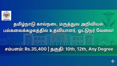 தமிழ்நாடு அரசு வேலையை எதிர்பார்த்துக் காத்திருக்கும் இளைஞர்களுக்கு ஒரு மகிழ்ச்சியான செய்தி வெளியாகியுள்ளது. தமிழ்நாடு கால்நடை மருத்துவ அறிவியல் பல்கலைக்கழகம் (TANUVAS) பல்வேறு காலிப்பணியிடங்களை நிரப்புவதற்கான அதிகாரப்பூர்வ அறிவிப்பை வெளியிட்டுள்ளது. உதவியாளர், ஓட்டுநர், சுருக்கெழுத்தர் உட்பட மொத்தம் 60 பணியிடங்கள் காலியாக உள்ளன. இதற்கான தகுதிகள் மற்றும் விண்ணப்பிக்கும் முறைகளை இங்கே விரிவாகக் காண்போம்.