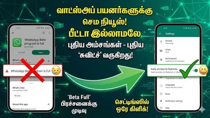 வாட்ஸ்அப் ஆண்ட்ராய்டு பீட்டா பதிப்பு 2.26.2.11-ல் இந்த வசதி தென்பட்டுள்ளது. செட்டிங்ஸில் சென்று இந்த சுவிட்சை 'ஆன்' செய்வதன் மூலம், தேர்ந்தெடுக்கப்பட்ட சில பீட்டா அம்சங்களை நீங்கள் பெறலாம். ஒருவேளை அந்தச் சோதனைக் பதிப்பில் உள்ள கோளாறுகள் (Bugs) உங்களுக்குப் பிடிக்கவில்லை என்றால், எந்த நேரத்திலும் அந்த சுவிட்சை 'ஆஃப்' செய்துவிட்டு, நிலையான பொதுப் பதிப்பிற்கு (Stable Version) மாறிக்கொள்ளலாம்.