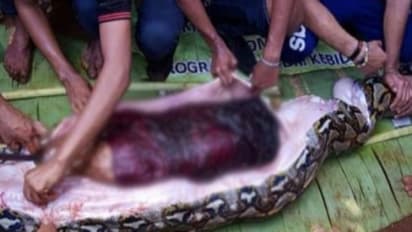 சடலம் 23 அடி மலைப்பாம்பு வயிற்றை கிழித்து அந்த பெண்ணின் சடலத்தை மீட்டு உள்ளனர் ஊர் மக்கள்.