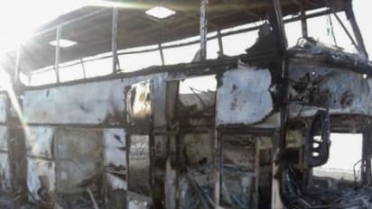 இந்நிலையில் இவர்கள் பயணம் செய்த பேருந்தில் திடீரென தீவிபத்து ஏற்பட்டது. இதையடுத்து இதுகுறித்து தகவலறிந்து வந்த மீட்பு குழுவினர், பயணிகளை மீட்கும் பணியில் ஈடுபட்டனர். தீயின் வேகம் கடுமையாக இருந்ததால் மீட்கும் பணி தாமதப்பட்டது.
