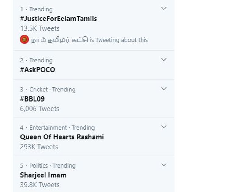 இந்நிலையில் #JusticeForEelamTamils என்கிற ஹேஷ்டேக்கை உருவாக்கி ட்விட்டர் பக்கத்தில் ட்ரெண்டாக்கி வருகின்றனர். இந்த ஹேஷ்டாக்கில் நாம் தமிழர் கட்சியை சேர்ந்தவர்கள் கோத்தபய அரசுக்கு எதிராக கடும் கண்டனம் தெரிவித்து கதறி வருகின்றனர்.