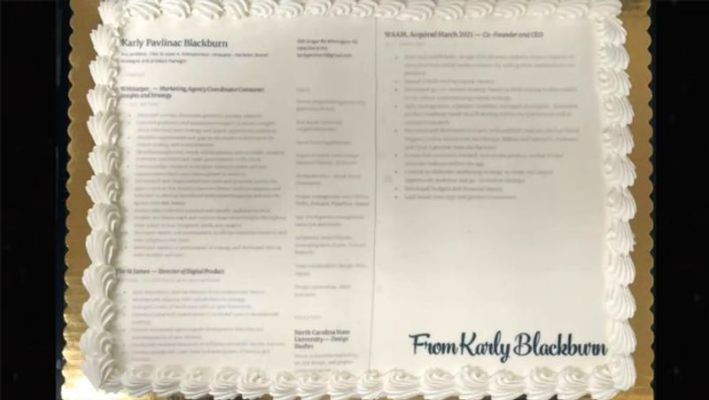 இதுகுறித்து ட்விட்டரில் பதிவிட்ட அந்த பெண், 'சில வாரங்களுக்கு முன்பு நான் நைக்கிற்கு கேக் மூலம் தனது ரெஸ்யூம்மை அனுப்பினேன். அந்நிறுவனம் தற்போது யாருக்கும் வேலை வாய்ப்பு வழங்க தயாராக இல்லை. ஆனால் நான் யார் என்பதை அந்த நிறுவனத்திடம் தெரியப்படுத்துவதற்காகத்தான் கேக்கில் ரெஸ்யூமை தயார் செய்து அனுப்பினேன்’ என்று பதிவிட்டுள்ளார்.