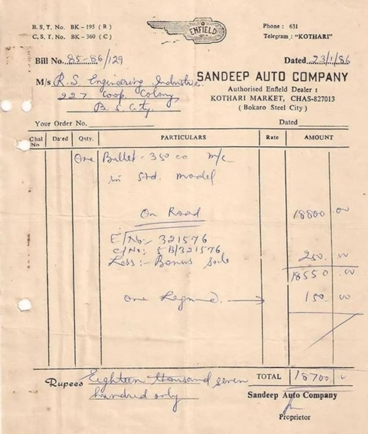 அண்மையில் 1986-ல் வாங்கப்பட்ட ராயல் என்ஃபீல்டு புல்லட் 350 பைக்கின் பில் ஒன்று சமூக வலைதளங்களில் வைரலாகப் பரவி வருகிறது.
