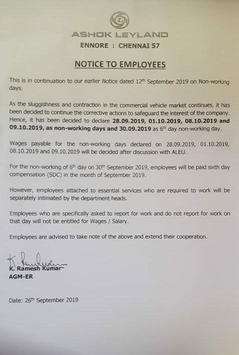 இந்தியாவில் தற்போது நிலவும் பொருளாதார மந்தநிலையால் ஆட்டோ மொபைல் துறை பெரிதும் பாதிக்கப்பட்டுள்ளது. கனரக வாகனங்கள் உற்பத்தியில் முன்னணி வகித்த நிறுவனங்களில் ஒன்றான அசோக் லேலண்ட் பொருளாதார மந்தநிலை காரணமாக தேக்கத்தை சந்தித்துள்ளது. விற்பனைக் குறைவு காரணமாக உற்பத்தியை தற்காலிகமாக நிறுத்துவது என்று முடிவெடுத்த அந்நிறுவனம் கடந்த மாதம் 5-ம் தேதி வெளியிட்ட அறிவிப்பில், எண்ணூர் தொழிற்சாலை ஊழியர்களுக்கு செப்டம்பர் 6-ம் தேதி முதல் 11-ம் தேதி வரை கட்டாய விடுமுறை என்று அறிவித்தது.
