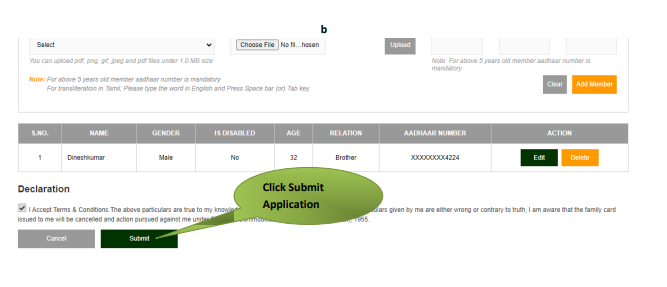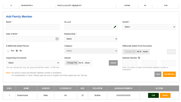 - உறுப்பினர்விவரங்களைச்சேர்க்கவும்:புதியஉறுப்பினரின்பெயர், பாலினம், பிறந்ததேதி, குடும்பத்தலைவருடனானஉறவு, ஆதார்எண்போன்றவிவரங்களைஉள்ளிடவும்.