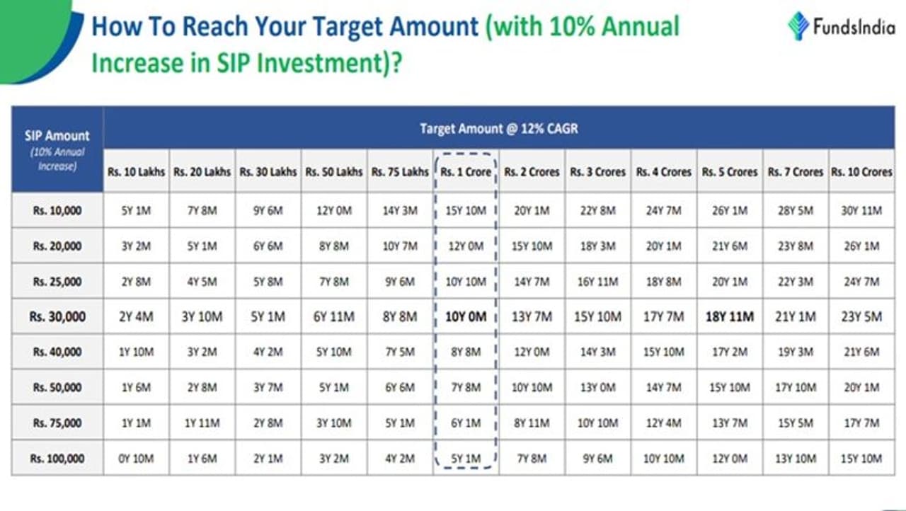 உதாரணத்துக்கு நீங்கள் மாதந்தோறும் ரூ.30,000 முதலீடு செய்ய ஆரம்பித்து, ஒவ்வொரு வருடமும் இந்த முதலீட்டை 10 சதவீதம் அதிகரிக்கிறீர்கள் என்று வைத்துக்கொள்வோம். அதாவது அடுத்த வருடம் 10 சதவீதம் அதிகமாக சேர்த்து முதலீடு செய்ய வேண்டும். அப்படியானால், FundsIndia's Wealth Conversations நவம்பர் 2023 அறிக்கையின்படி, நீங்கள் 10 ஆண்டுகளில் ரூ.1 கோடியும், 19 ஆண்டுகளுக்குள் ரூ.5 கோடியும், 23 ஆண்டுகள் 5 மாதங்களில் ரூ.10 கோடியும் உங்களுக்கு கிடைக்கும்.