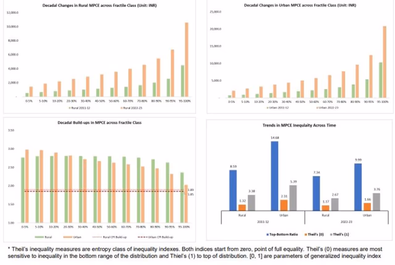 குறிப்பாக உத்தரப்பிரதேசம், பீகார், மத்தியப்பிரதேசம் கிராமங்களில் வளர்ச்சி விகிதம் அதிகரித்துள்ளது என்று ஆய்வில் தெரிய வந்துள்ளது. மேலும், கிராமங்களில் நுகர்வு ரீதியான சமத்துவம் சமூக மக்களிடையே எந்தவித வேறுபாடும் இல்லாமல் அதிகரித்து வந்துள்ளது. இது கிராமங்களில் 0.365 லிருந்து 0.343 ஆக குறைந்துள்ளது.